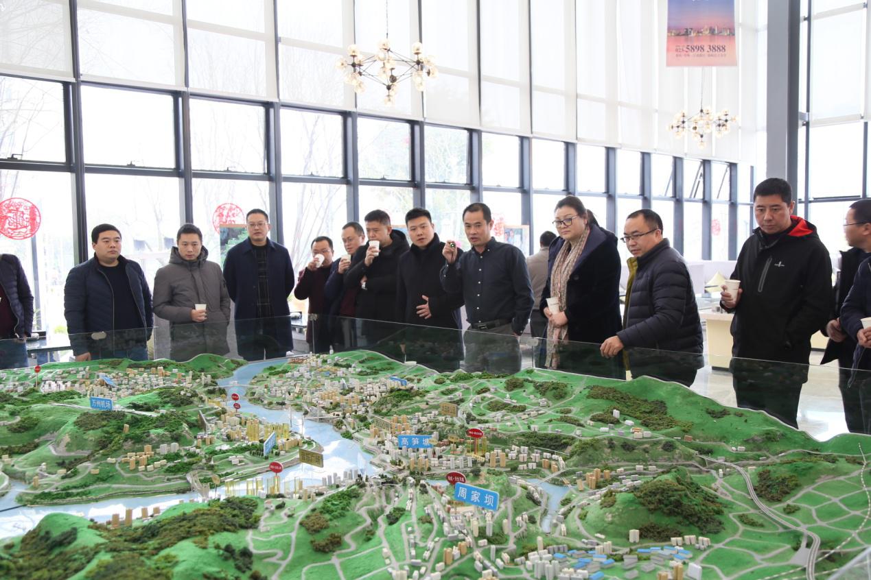 在长江之星售房部,李董事长借助沙盘模型,就城市规划,特别是海成集团各项目在城市中的定位和建设效果,进行了详细的解读,石县长对海成集团在万州城市建设中发挥的作用十分认同。