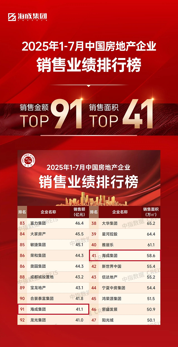在中指研究院最新数据中,海成以41.1亿元的销售额,位列2025年1-7月全国房地产企业销售业绩榜第91名;以58.6万㎡的销售面积,位列2025年1-7月全国房地产企业销售业绩榜第41名。