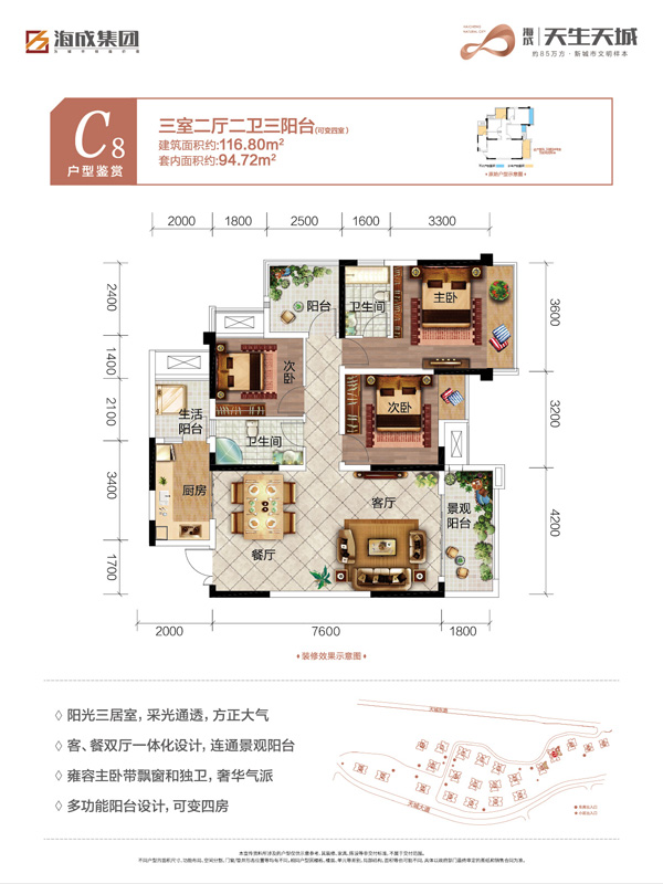 海成·天生天城,位于周家坝心连心广场旁,占据城北核心位置,帷幄城市稀贵土地,扛鼎万州战略发展区域;项目汇集丰富业态,以双城市公园、菁英医教、智慧社区、社区商业中心、生态商业公园、文旅休闲街区、主题旅游景区、格调餐饮、半山民宿等多元配套,为业主提供美好居家体验;同时以星级物业、五彩生活家体系、全龄架空层等匠心设计为一体;融合休闲、娱乐、健康、医教、文旅等元素,构筑多功能全能生活圈;三好生活大城始于一座天生天城。
